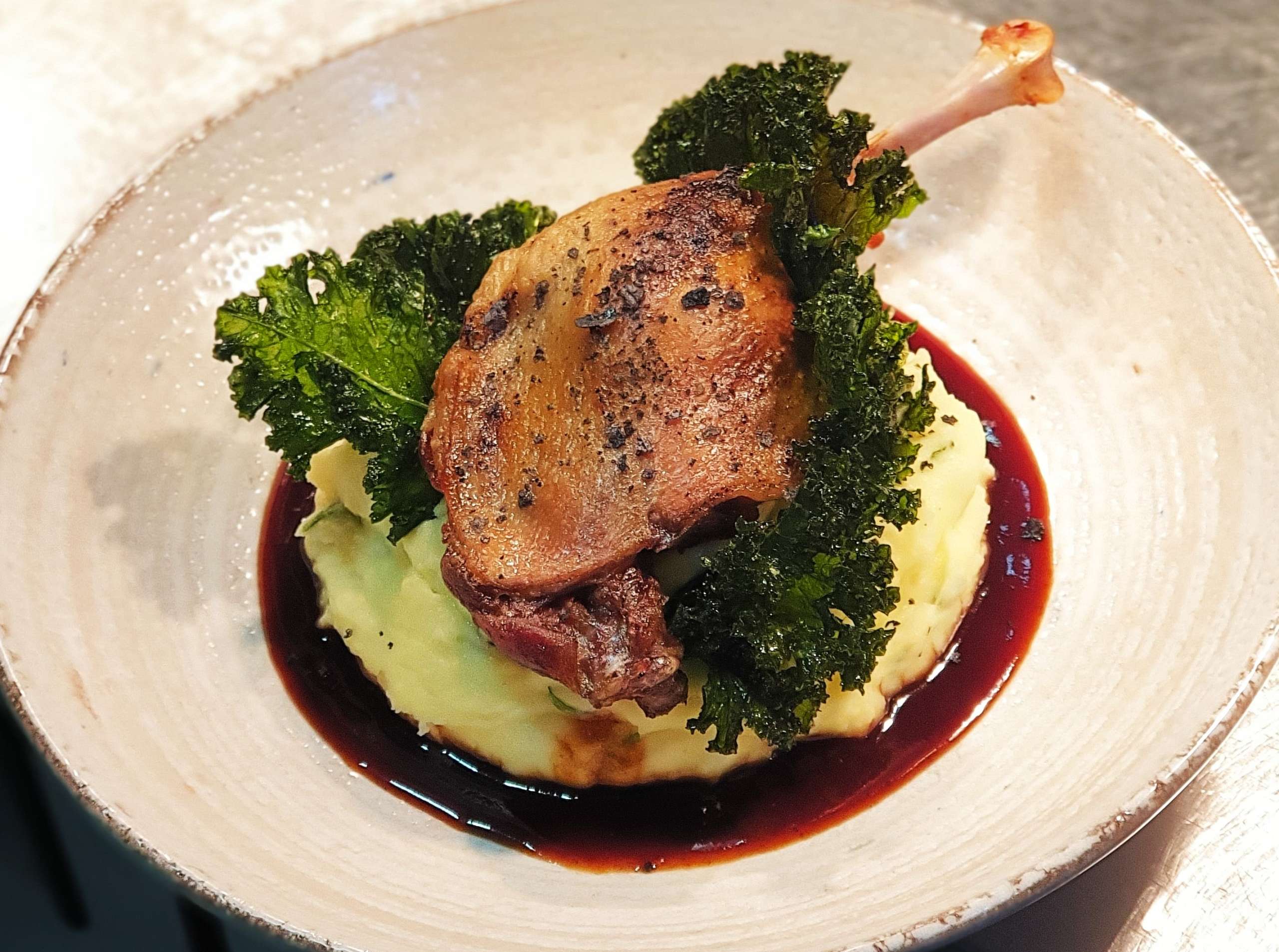 Pulpă de rață Pulpă de rață+ sos Gastrique cu ananas, chips de Kale și piure de cartofi cu ceapă verde (245 g)84 lei Rezervă o masă online Mai multe preparate POINT: