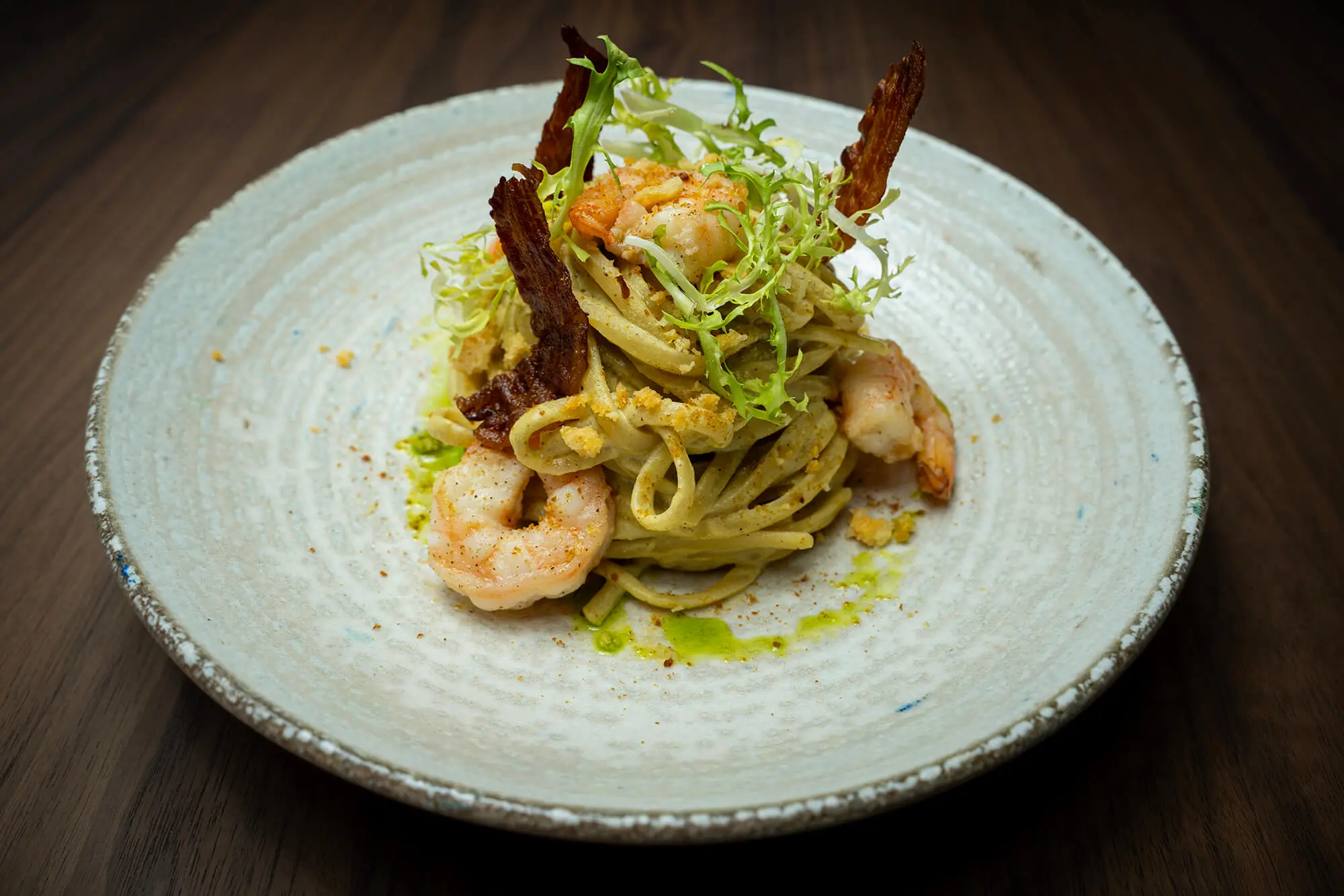 Linguini cu creveți Linguini cu creveți+ fistic, crispy pancetta, crumble parmezan (430 g) / variantă fără gluten58 lei Rezervă o masă online Mai multe preparate POINT: