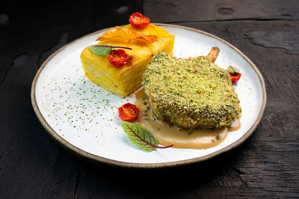 Tomahawk de porc Tomahawk de porcgătit la sous-vide, în crustă de ierburi, cu sos de piper + cartofi Dauphinoise (700 g)88 lei Rezervă o masă online Mai multe preparate POINT: